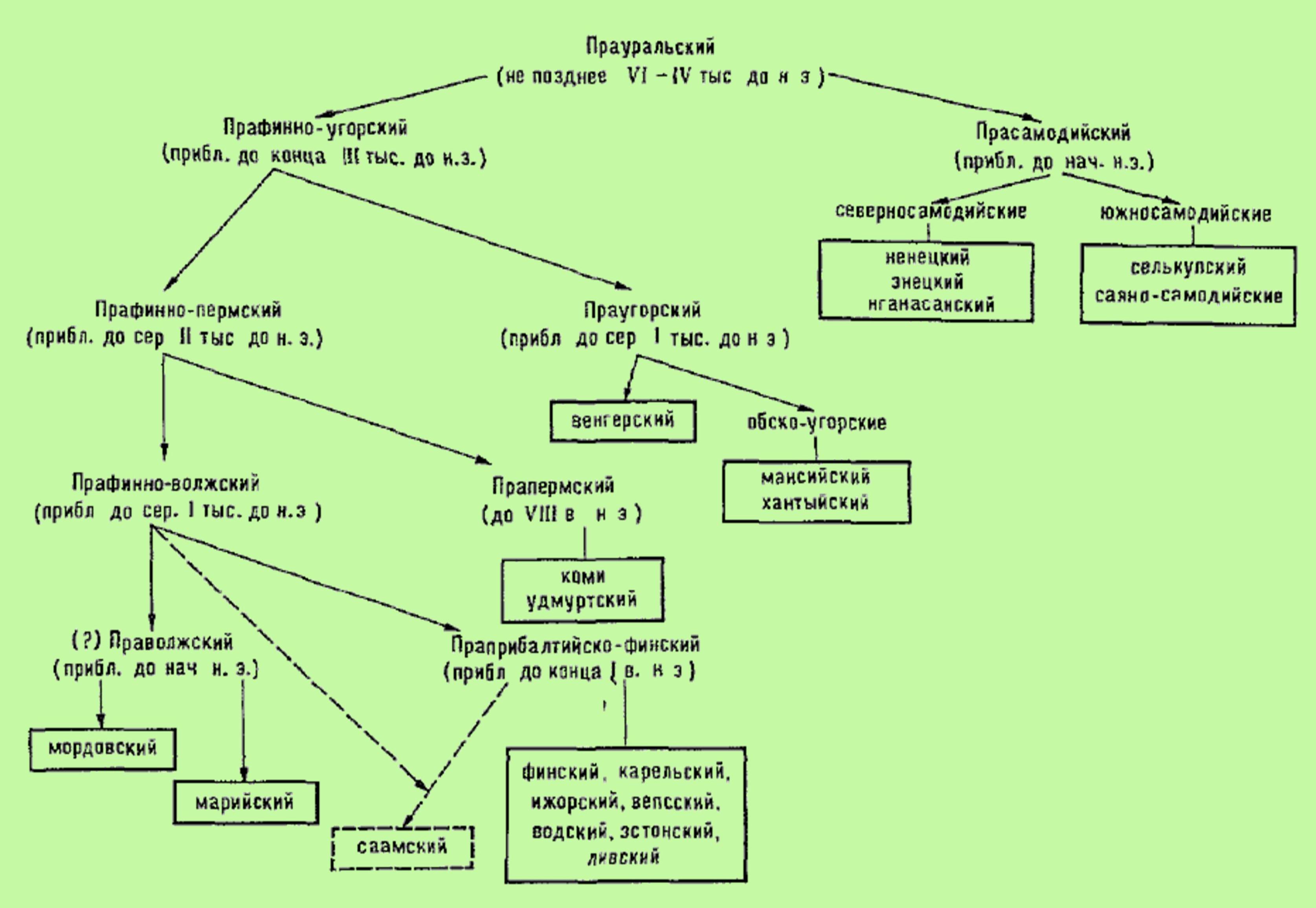 Классификация приводится по монографии П. Хайду «Уральские языки и народы» [Хайду 1985: 173]. Обратите внимание, что в родстве с финским языком – фундаментом Квенья – состоят языки обских угров и венгерский, который упоминается в неоконченном романе Дж. Толкина «Записки клуба “Мнение”».